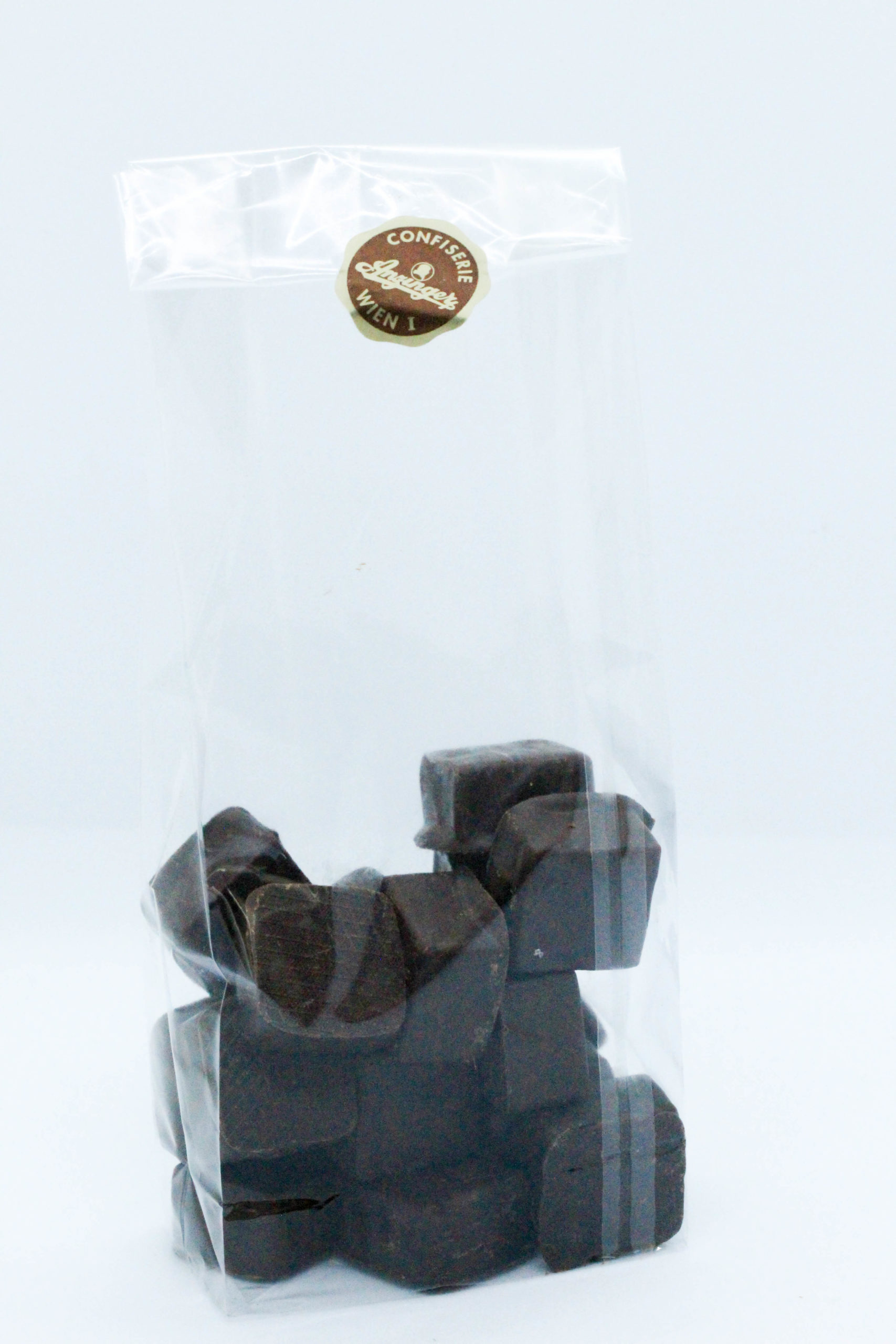 Fondant, Verdickungsmittel E 406, Säure E 330, natürl.Aroma, gefärbt E 124, E 132, Überzugsmasse: 70% Kakaobestandteile.