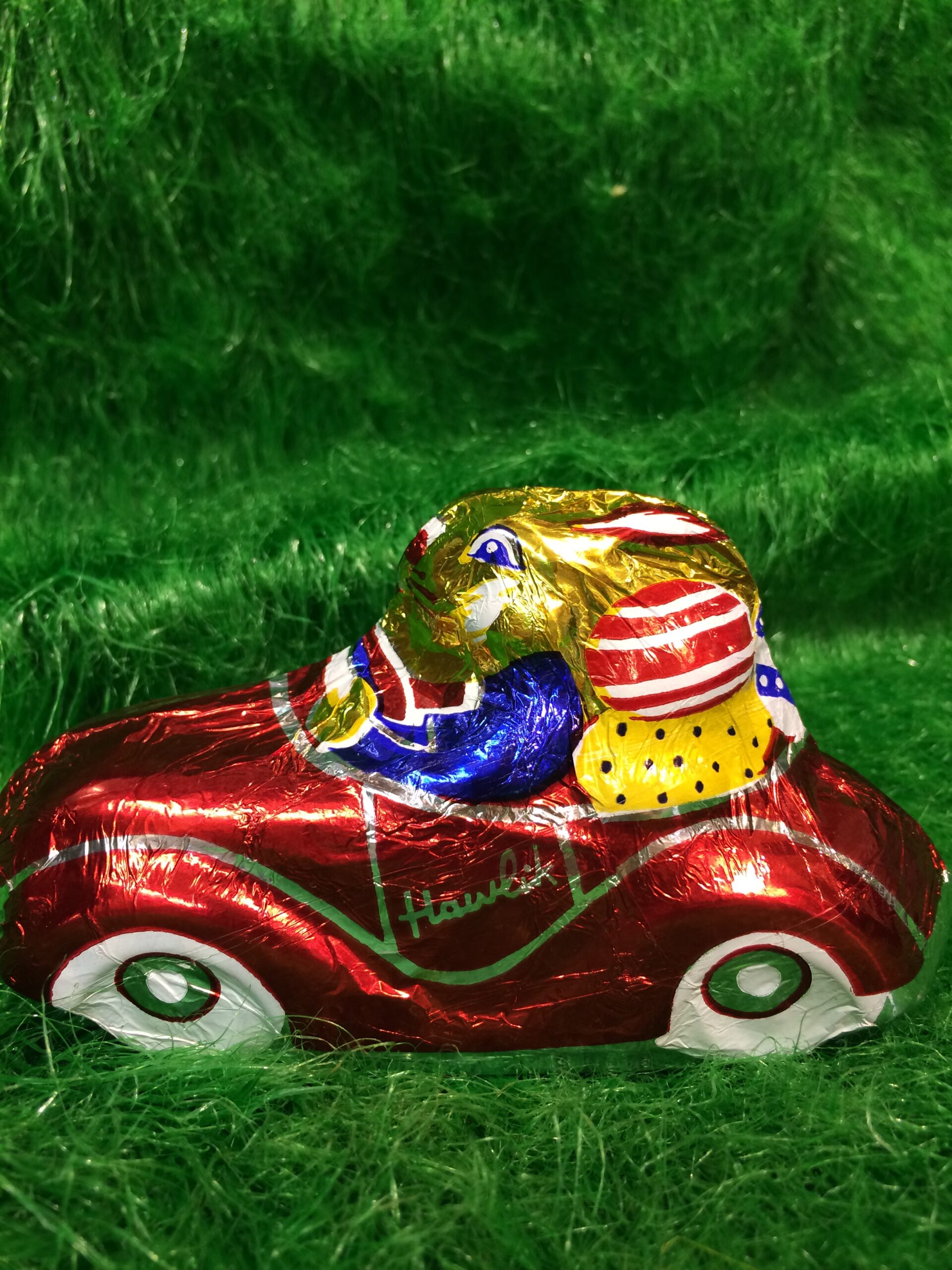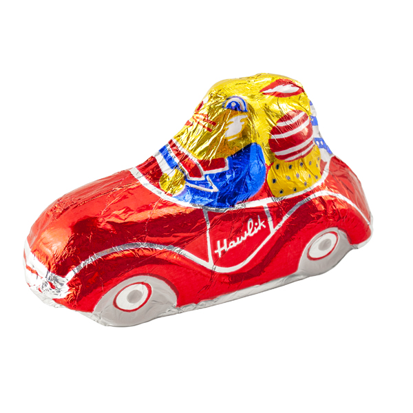 In jedes Osternestchen gehört ein Osterhase. Das süße Häschen im Rennauto ist eine hübsche Ergänzung und lässt die Augen des Beschenkten strahlen. Beste handgeschöpfte Vollmilchschokolade wird handverpackt in liebevoll gestaltetem Staniol. Klassische Schokofiguren, wie wir sie von früher kennen.