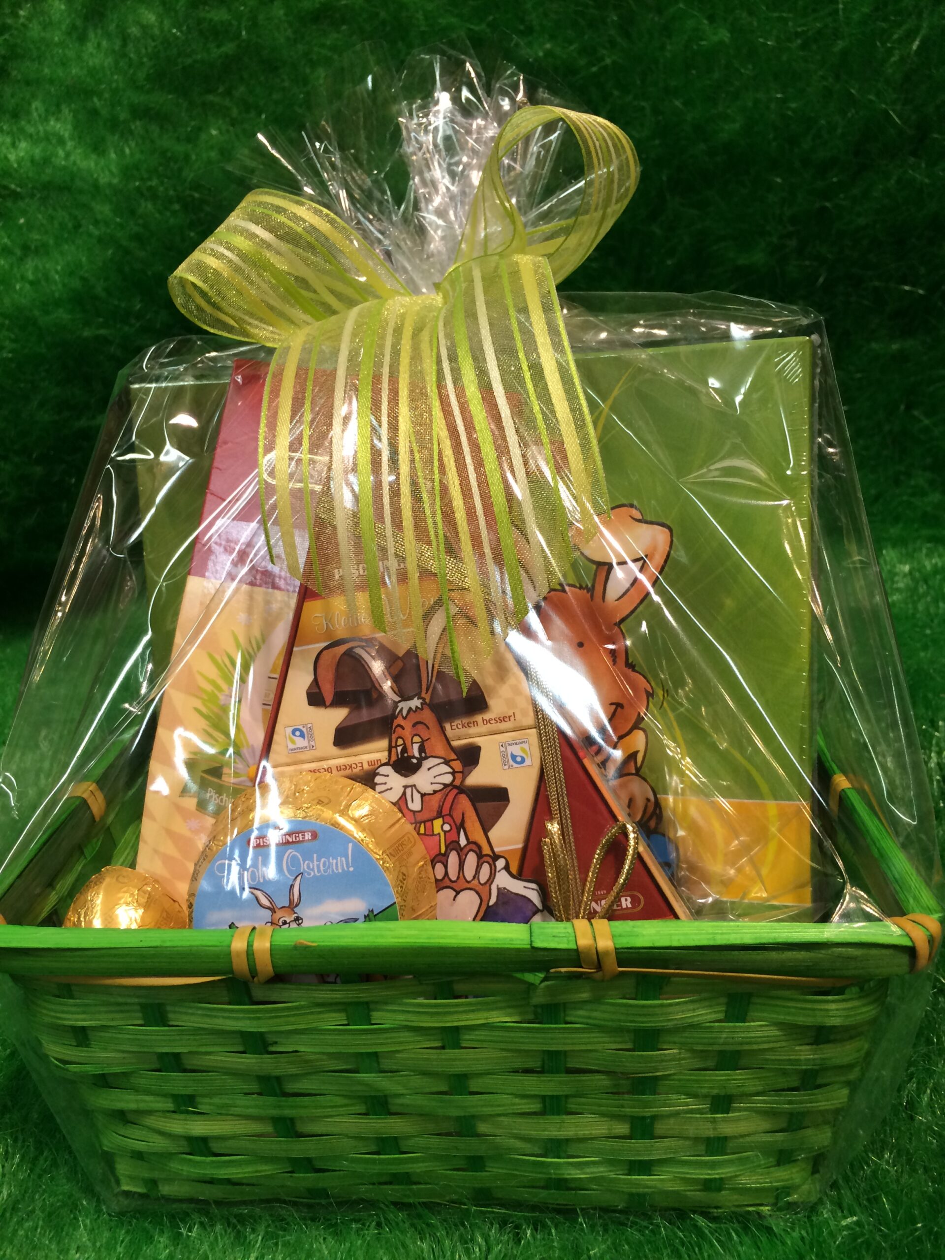 Fertig gefüllter Osterkorb für Ihre Liebsten. Wir nehmen Ihnen die Arbeit ab und fertigen die perfekten Osterkörbchen an.