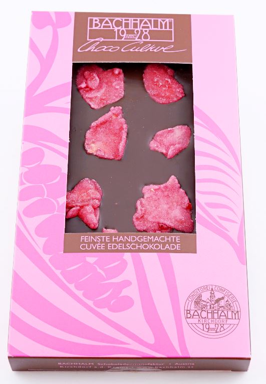 Bachhalm Cuvée Zartbitter Schokolade verfeinert mit Absolue Rosenöl. Von Hand bestreut mit der "Königin der Blumen", mit kandierten Rosenblütenblättern der Centifolia-Rose für ein königliches Geschmackserlebnis.