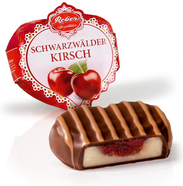 Confiserie-Pasteten höchster Qualität. Die beliebte Schwarzwälder-Kirsch-Torte in Pastetenform. In Kirschwasser eingelegte Kirsch-Stückchen auf Marzipan, umhüllt mit edler Zartbitter-Schokolade.