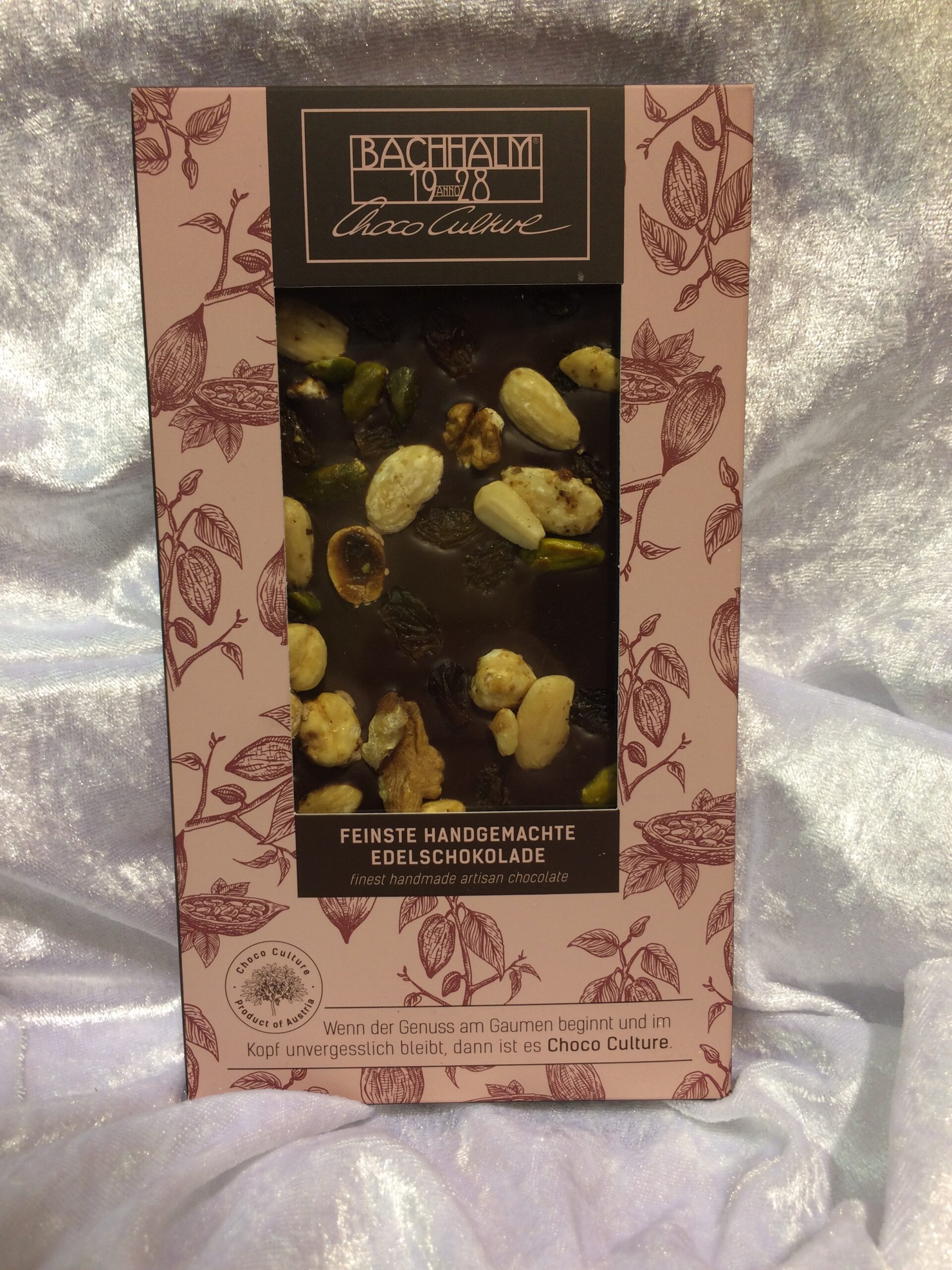 Wunderbar milde Schokolade, bestreut mit Edelnüssen.